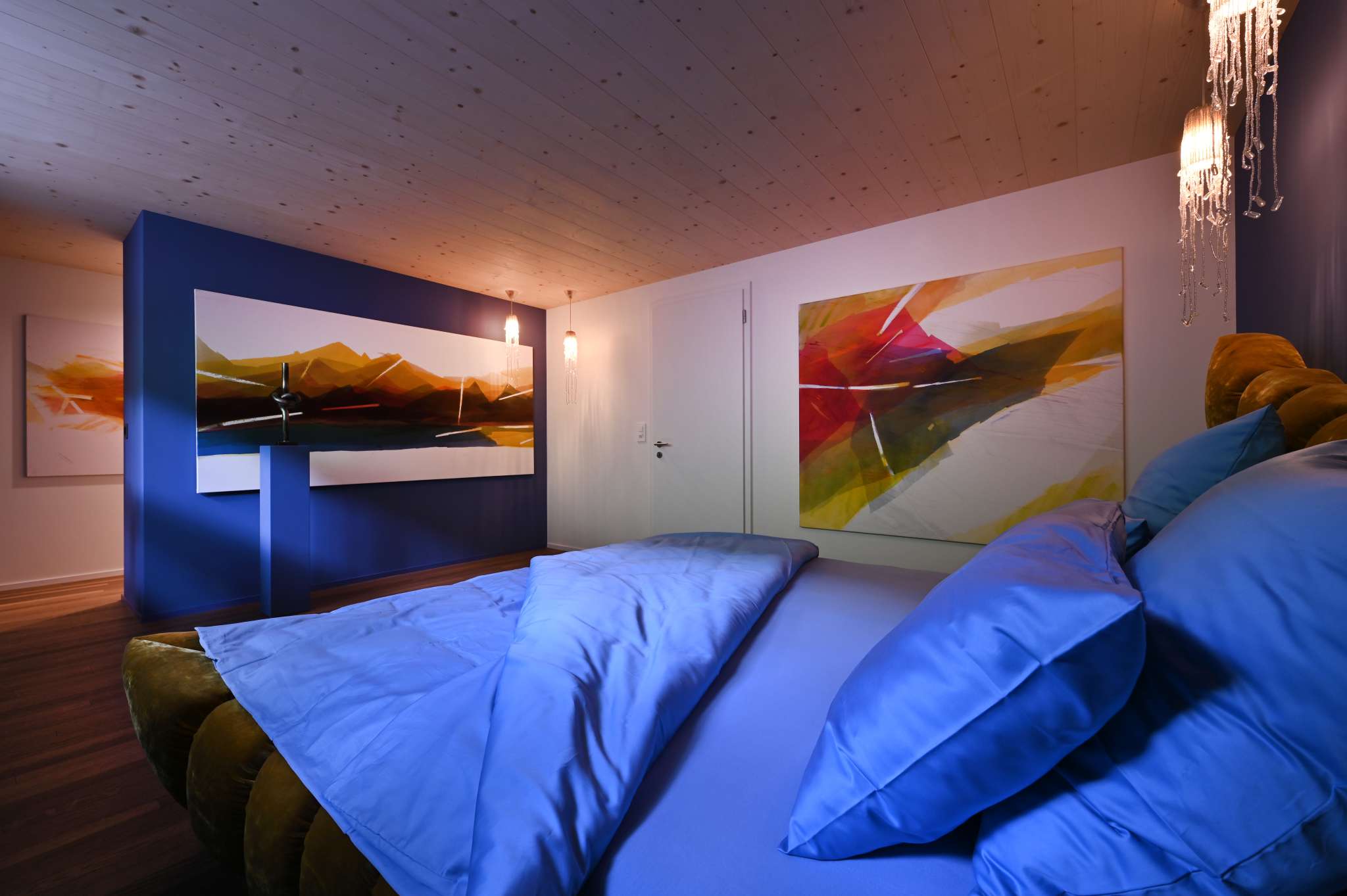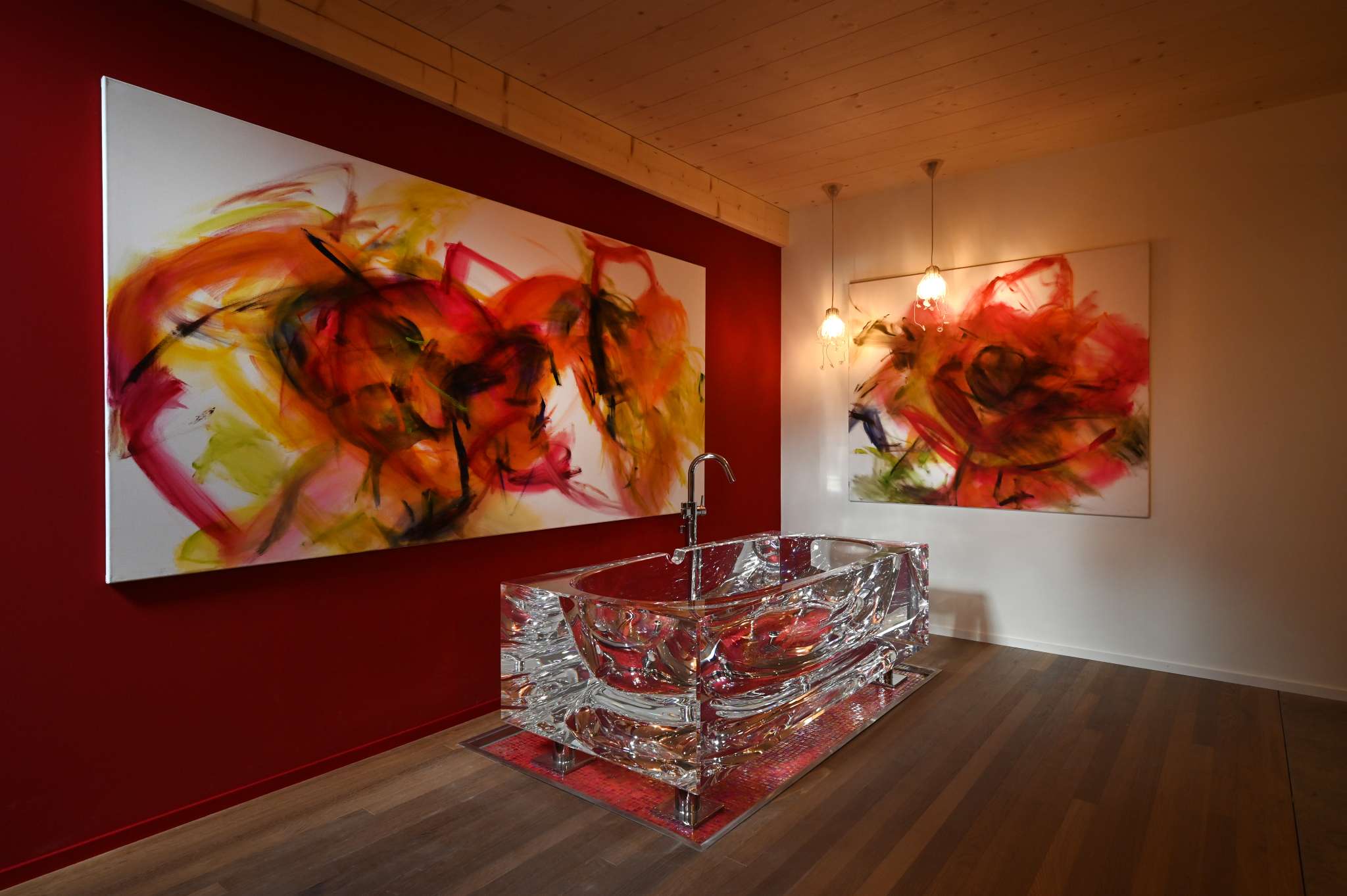 Kunst ist das Herzstück des Roggegratbads. In der hauseigenen BLUE-art Galerie, die nur auf Voranmeldung besucht werden kann, sind Werke von Brigitte Buck Litscher und Heiko Schütz ausgestellt – ergänzt durch Objekte regionaler Kunstschaffender.